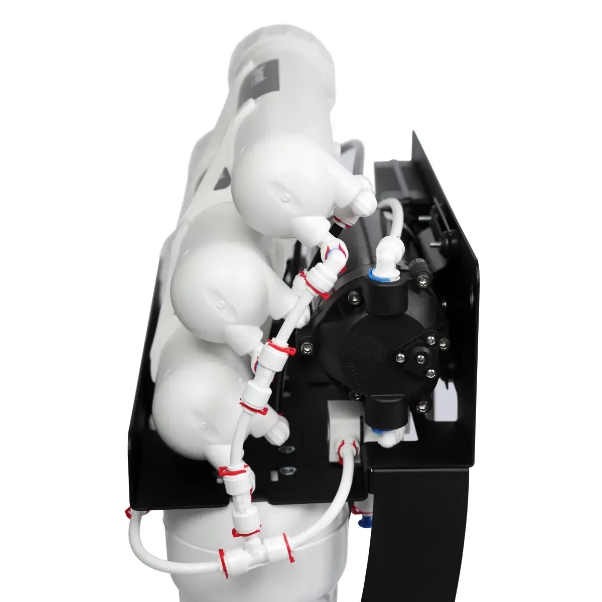 Tradycyjne filtry RO pracują z wykorzystaniem zbiornika, który magazynuje wodę, co ogranicza przepływ i zajmuje więcej miejsca. ECOSOFT RObust Mini działa inaczej – to system odwróconej osmozy bez zbiornika, który filtruje wodę w czasie rzeczywistym, z wydajnością do 60 litrów na godzinę. Dzięki temu zapewnia stały dopływ świeżej wody, zajmuje mniej przestrzeni pod zlewem i lepiej sprawdza się w biurach, kawiarniach oraz miejscach o większym zapotrzebowaniu na czystą wodę. Krótko mówiąc: RObust Mini jest szybszy, wydajniejszy i bardziej kompaktowy niż klasyczne systemy RO.